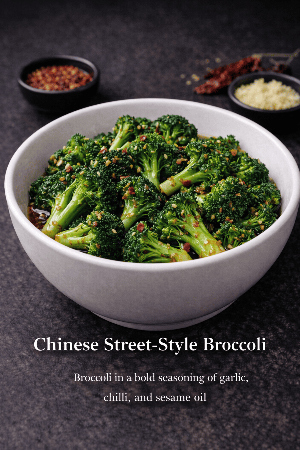 Broccoli in a bold seasoning of garlic, chilli, and sesame oil.