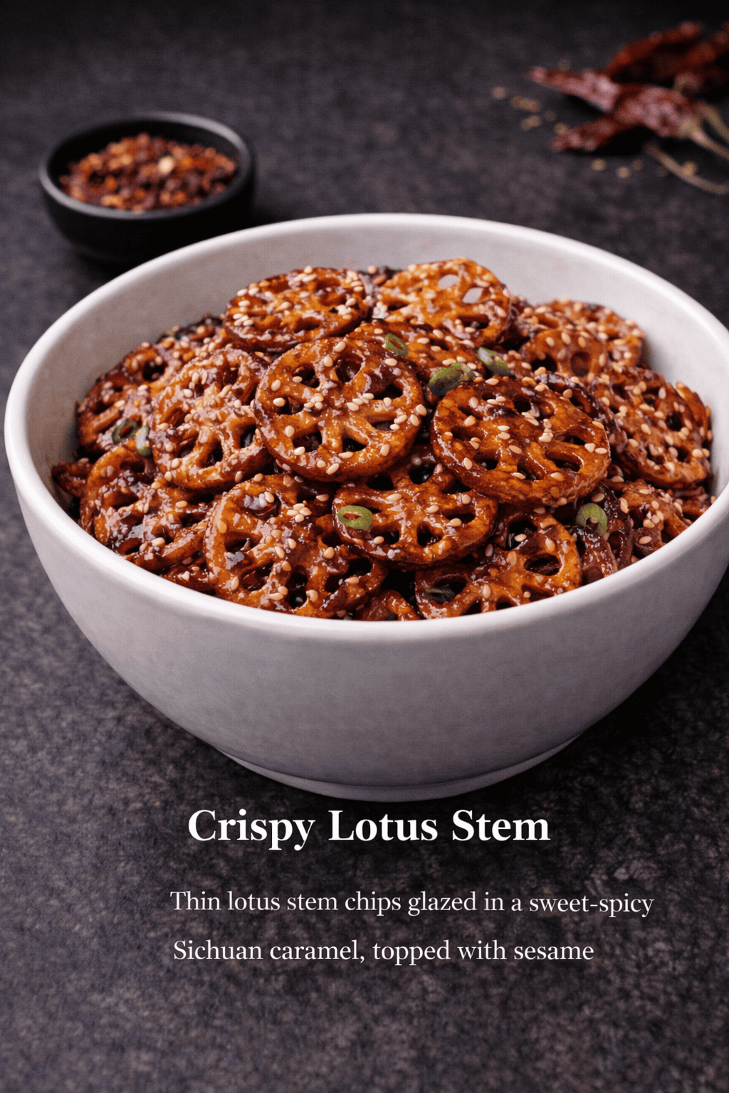 Thin lotus stem chips glazed in a tangy-spicy sauce, topped with sesame.