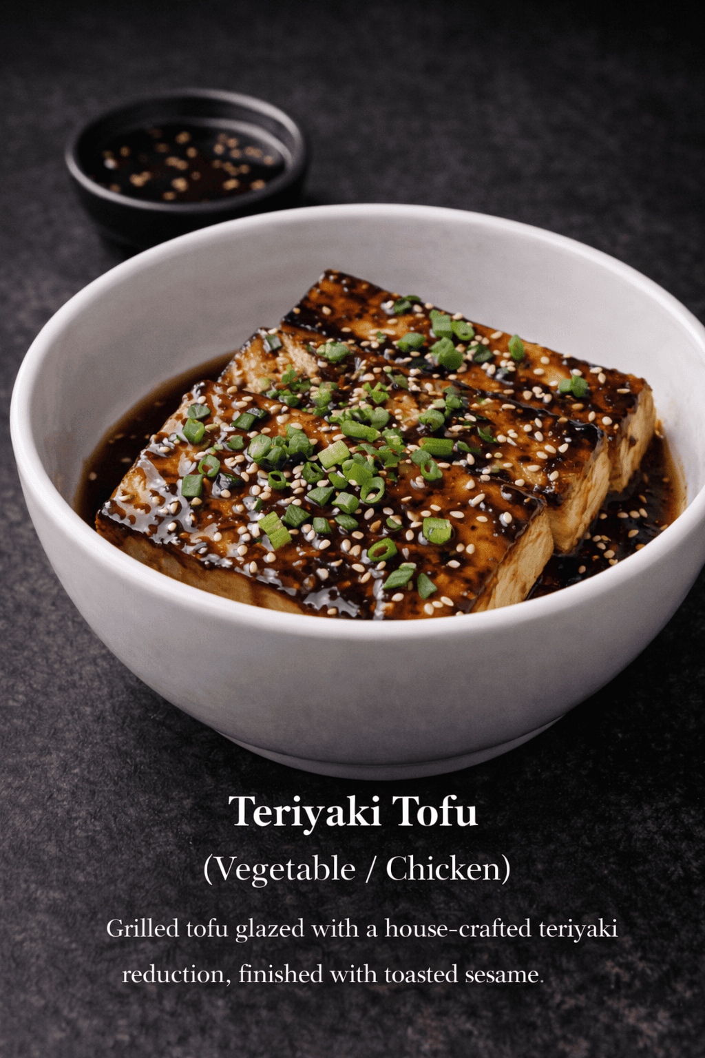 Grilled tofu glazed with a house-crafted teriyaki reduction, finished with toasted sesame.