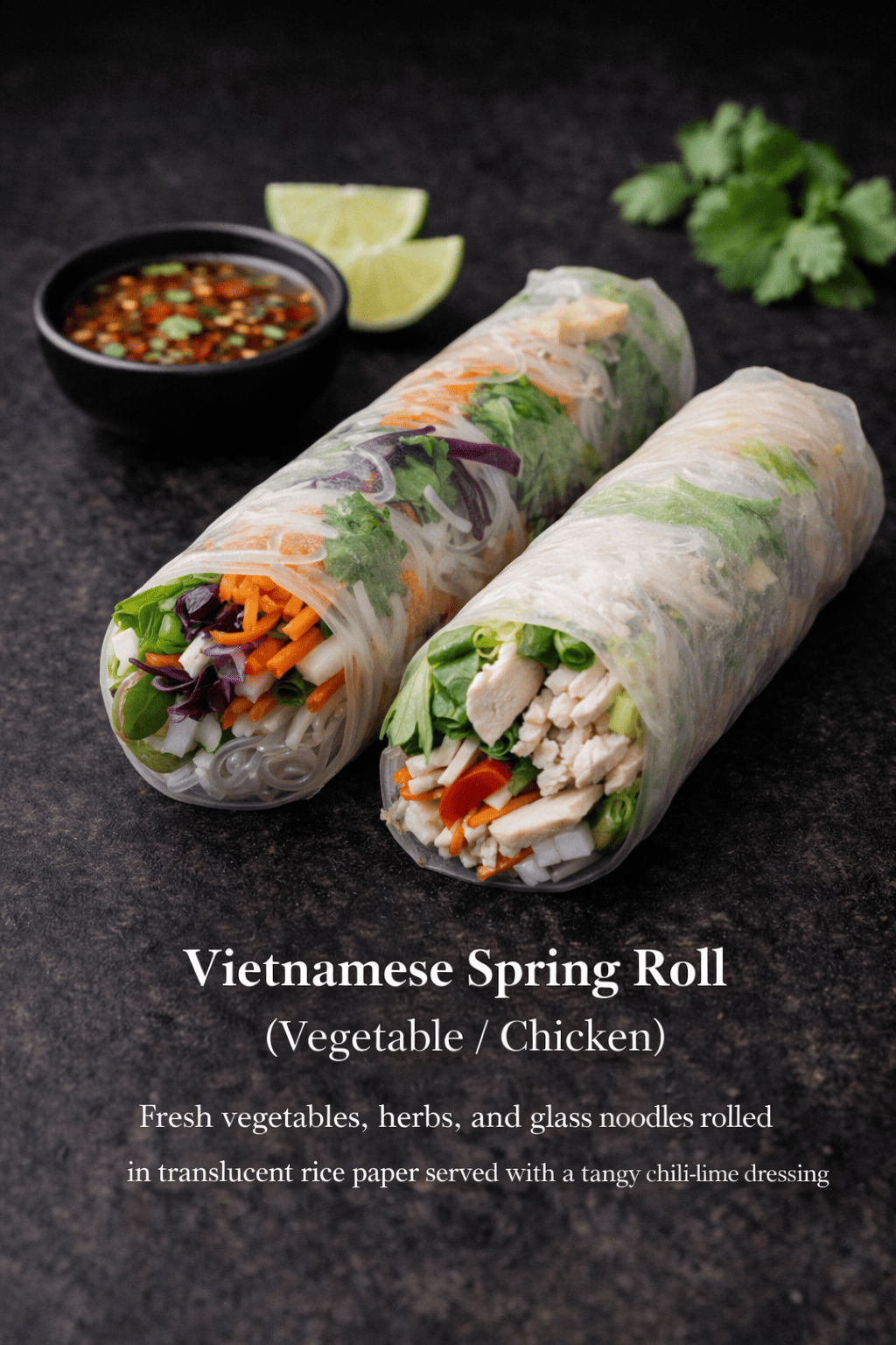 Fresh vegetables, herbs, and glass noodles rolled in translucent rice paper served with a tangy chilli-lime dressing.