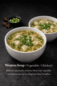 Delicate handmade wontons filled with vegetables or chicken, served in a fragrant, clear bouillon.