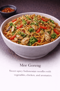 Sweet-spicy Indonesian noodles with vegetables, Chicken and aromatics.